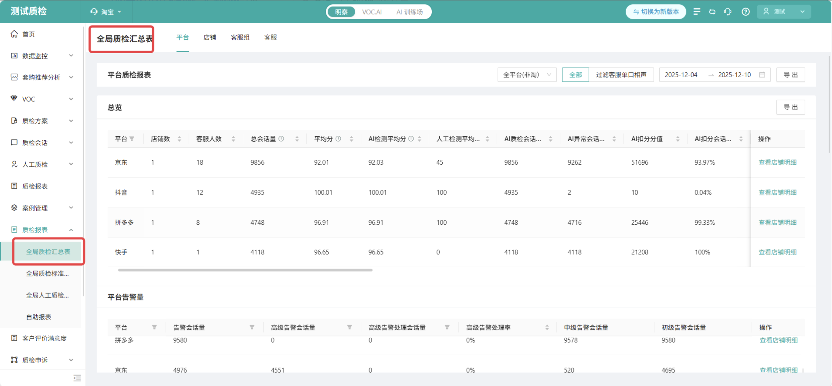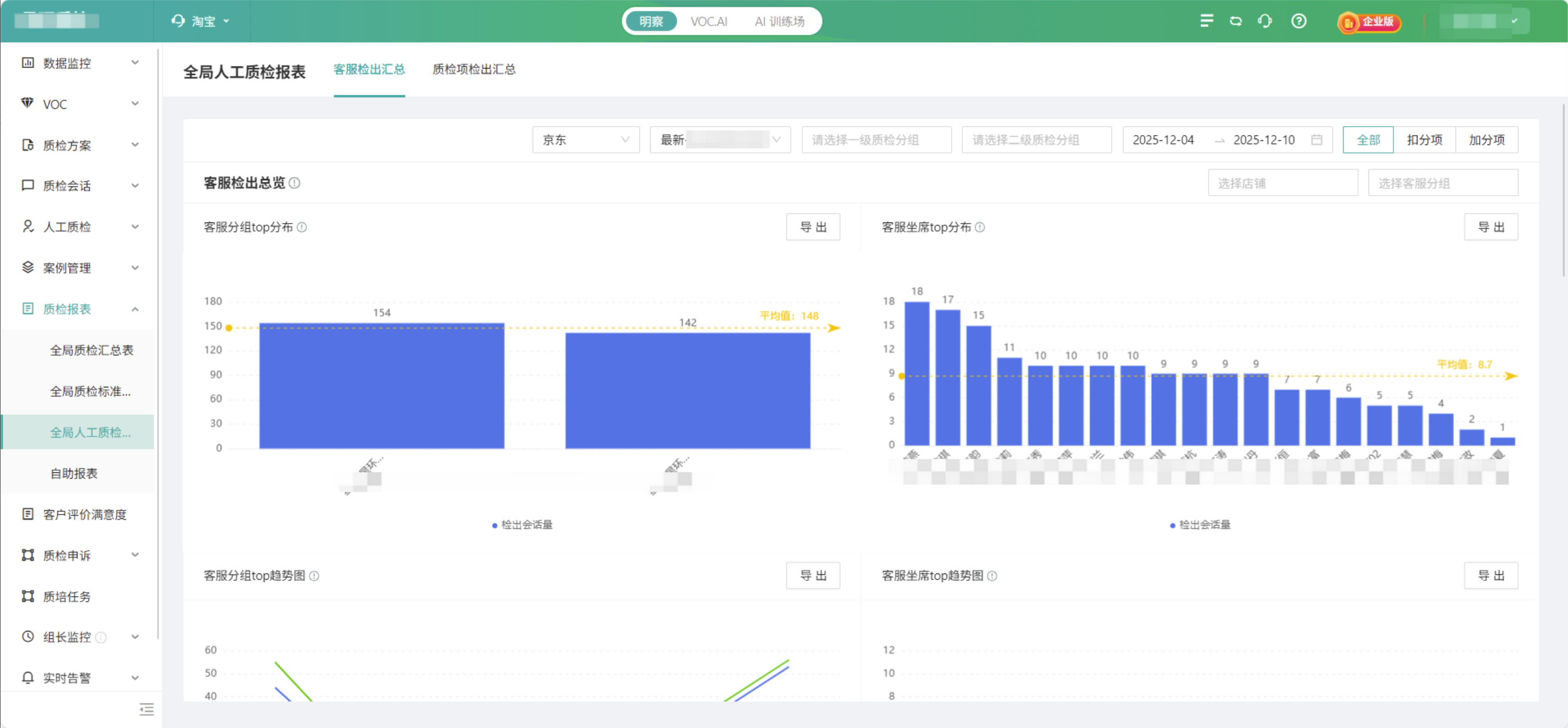 可从平台、店铺、客服组、客服四个维度,整体查看质检检出情况及对应平均分