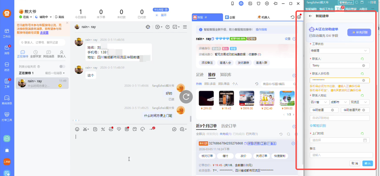 电商、客服日常建单繁琐:接待客户时需手动填单、选类型,易出错;多平台切换、工单类型不熟,新手难上手、老员工扛不住,还拉低客户体验。