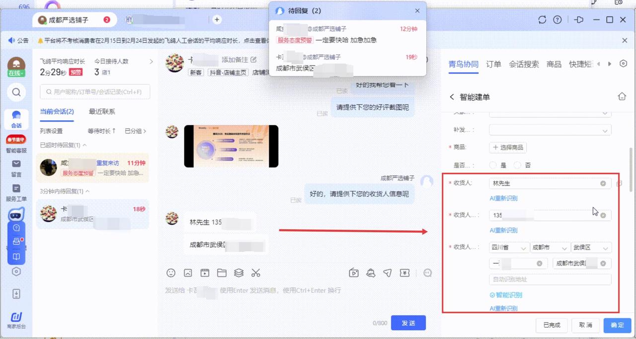 - 客服引导买家发补发的收货地址,AI 3秒就提取、解析地址信息,自动填入工单,客服仅需专注沟通。