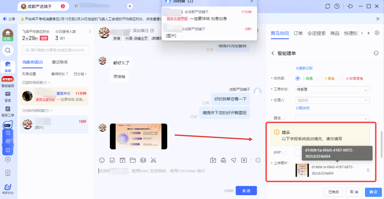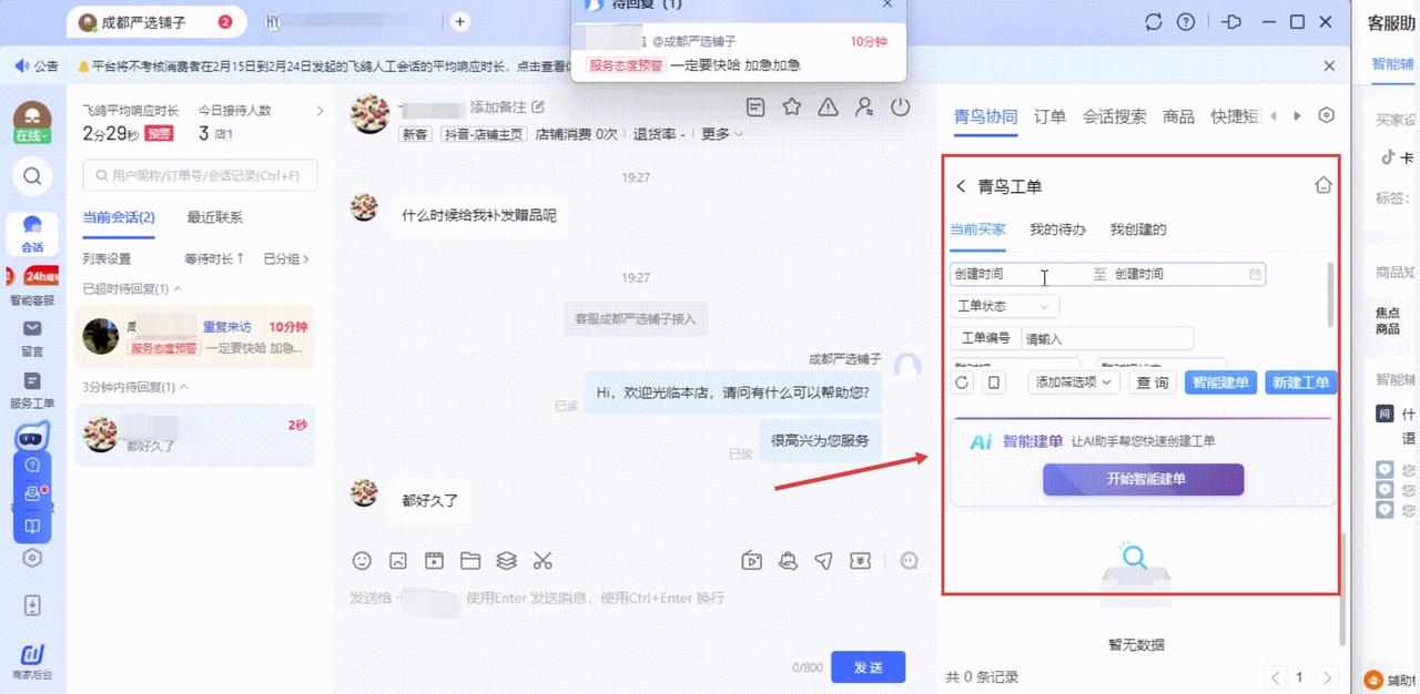 - 买家来咨询补发赠品,AI 3秒就响应,自动发起补发工单,还能自动填好相关信息,不用客服动手;